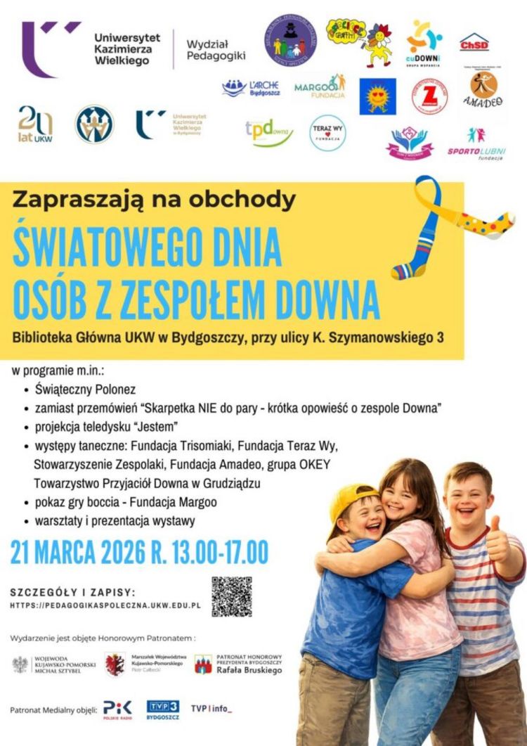 Wspólny polonez, czytanie książek, warsztaty, projekcja teledysku i coś słodkiego na deser - tak zapowiadają się obchody Światowego Dnia Zespołu Downa, które odbędą się w najbliższą sobotę (21.03) w godz. 13:00 – 17:00 w bibliotece UKW. W tym roku organizatorzy zrezygnowali z tradycyjnych, oficjalnych przemówień na rzecz bardziej otwartej i angażującej formuły wydarzenia. Na uczestników czeka wiele atrakcji, m.in. uroczyste otwarcie wyjątkowym Świątecznym Polonezem w uniwersyteckim holu, wspólne czytanie książki „Skarpetka NIE do pary – krótka opowieść o zespole Downa” autorstwa Anny Dolińskiej-Fojut, a także projekcja teledysku „Jestem” oraz występy artystyczne zaprzyjaźnionych fundacji i stowarzyszeń. Nie zabraknie również różnorodnych warsztatów — w programie przewidziano m.in. zajęcia ruchowo-taneczne, eksperymenty, gry stolikowe, pokazy gry w boccię oraz hortiterapię, czyli tworzenie ogrodów w słojach. Wydarzenie zwieńczy słodkie zakończenie, podczas którego na gości będzie czekał wspólny tort oraz liczne smakołyki.