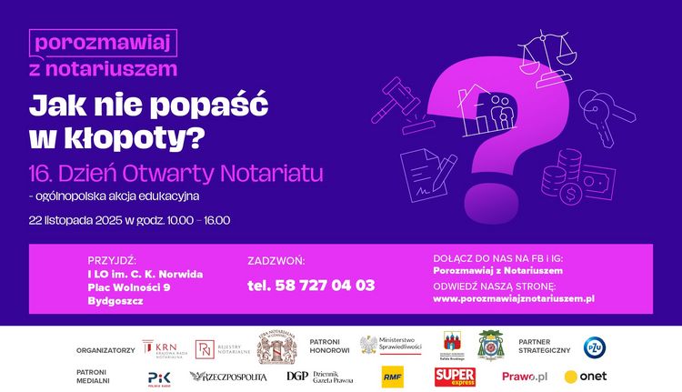 Celem 16. edycji Dnia Otwartego Notariatu jest uświadomienie, że notariusze mogą towarzyszyć w podejmowaniu wielu kluczowych decyzji i działań, które będą miały skutki prawne. W sobotę, 22 listopada udzielą bezpłatnych informacji prawnych i pomogą rozwiązać najczęstsze życiowe dylematy dotyczące m.in.: