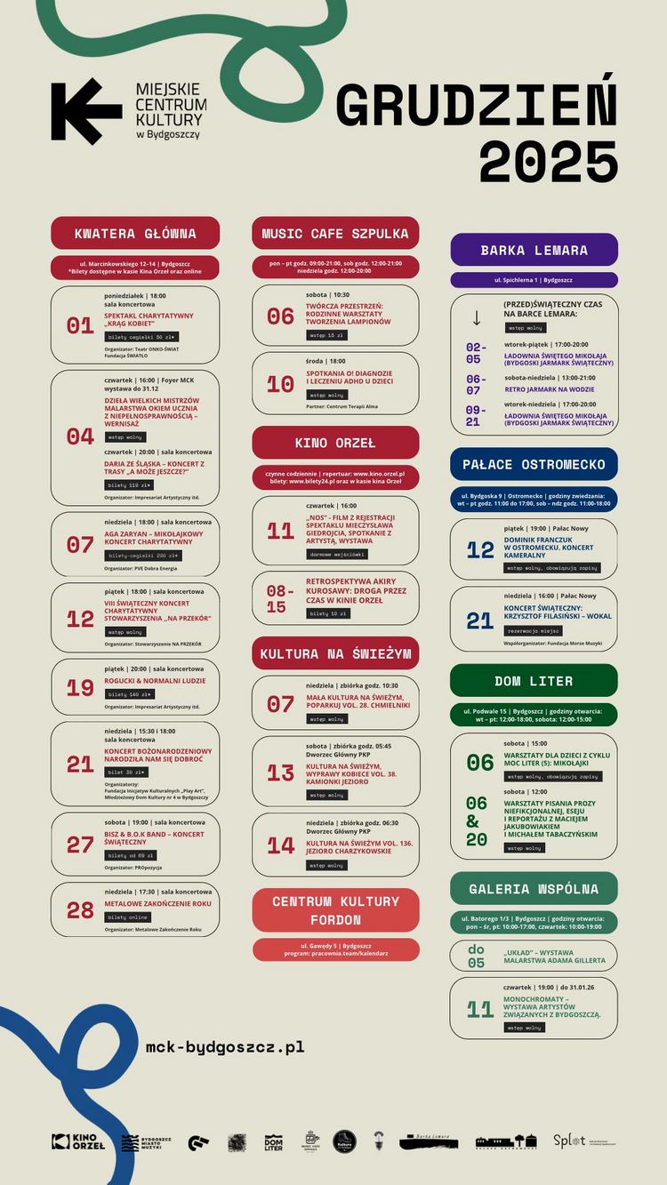 Po świętach, 27 grudnia o godz. 19.00, sala kinowo-widowiskowa MCK ponownie zapełni się muzyką – tym razem podczas świątecznego koncertu Bisz & B.O.K Band. Raper Bisz wraz z wieloosobowym, multiinstrumentalnym zespołem zaprezentuje utwory m.in. z albumów Labirynt Babel i Raport z walki o wartość, w aranżacjach łączących hip-hop z brzmieniem żywych instrumentów.