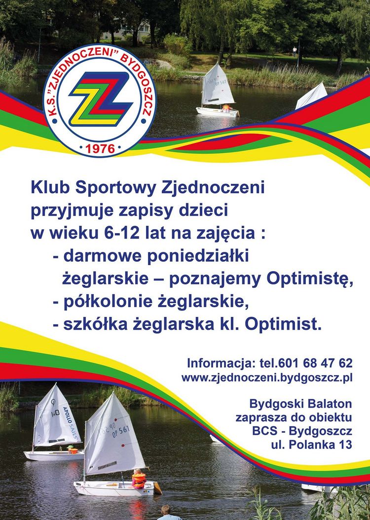 Klub Sportowy „Zjednoczeni” Bydgoszcz zaprasza wszystkie dzieci w wieku od 6 do 10 lat na bezpłatne sesje treningowe na łodziach klasy Optimist, które są jednymi z najpopularniejszych łodzi regatowych na świecie. Zajęcia odbywają się na bydgoskim Balatonie przy ulicy Polanka 13 w godzinach 17:30–19:30. Prowadzone są przez wykwalifikowanych oraz doświadczonych trenerów żeglarstwa, którzy zadbają zarówno o naukę, jak i bezpieczeństwo uczestników. Uczestnik zajęć ma do dyspozycji łódkę klasy Optimist oraz kamizelkę asekuracyjną.