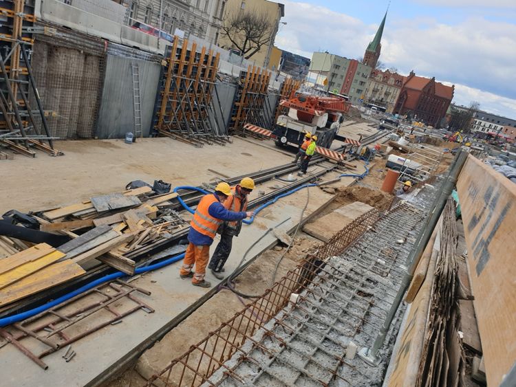 W wykopie najbardziej zaawansowane prace są prowadzone od strony ronda Bernardyńskiego. Przestrzeń między żelbetowymi palami jest dodatkowo zbrojona, zalewana betonem, z użyciem płyt dociskowych formowane są docelowe ściany.