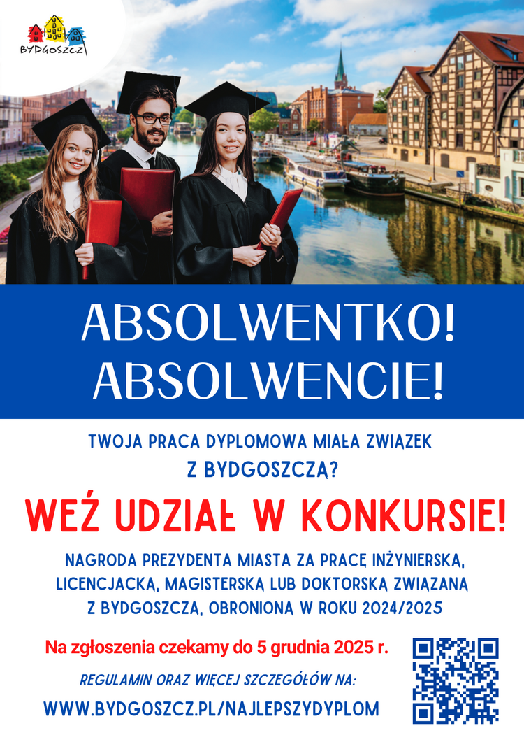 Pracę do konkursu zgłasza jej autor. Należy dostarczyć ją osobiście lub wysłać wraz z kompletem dokumentów zgłoszeniowych na adres: Biuro Komunikacji Społecznej, Urząd Miasta Bydgoszczy, ul. Jezuicka 1, 85-102 Bydgoszcz z dopiskiem: „Konkurs na pracę naukową”. Na zgłoszenia czekamy do 5 grudnia 2025 roku (decyduje data wpływu do Urzędu Miasta Bydgoszczy). Dokumenty do pobrania oraz szczegóły dotyczące konkursu dostępne są TUTAJ.