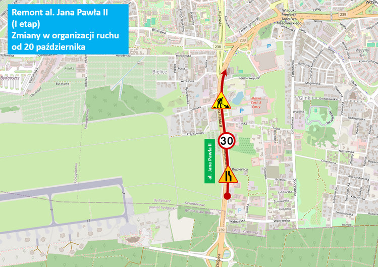 W trakcie remontu wprowadzona zostanie tymczasowa organizacja ruchu. Prace podzielona zostały na cztery etapy by minimalizować utrudnienia. Roboty rozpoczną się w poniedziałek (20 października). W pierwszym etapie zamknięty zostanie prawy pas ruchu jezdni w kierunku centrum miasta na odcinku od posesji przy al. Jana Pawła II 145 (od lotniska) do numeru 117 (kościoła) . Wprowadzone zostanie także ograniczenie prędkości do 30 km/h na lewym pasie.