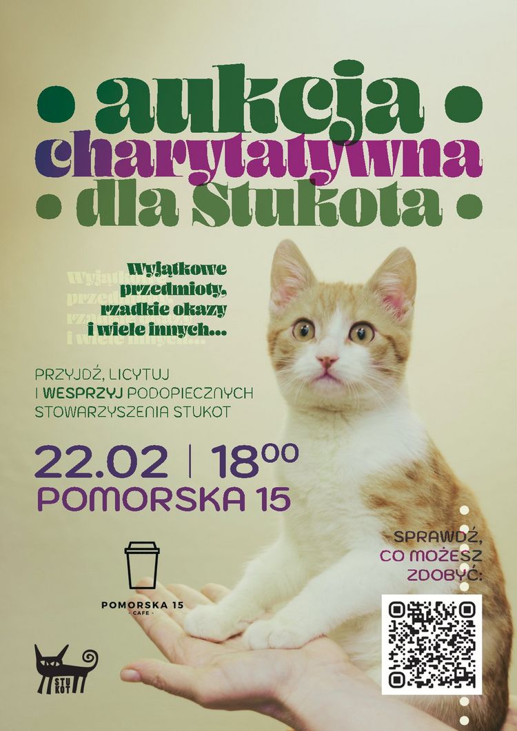 W niedzielę (22.02) odbędzie się aukcja charytatywna, z której całkowity dochód zostanie przeznaczony na działalność bydgoskiego Stowarzyszenie Stukot, od lat niosącego pomoc bezdomnym i pokrzywdzonym kotom. Aukcja rozpocznie się o godz. 18:00 w kawiarni Pomorska 15. Pod młotek trafi niemal 60 fantów, przekazanych przez około 30 darczyńców – bydgoskie (i nie tylko) firmy oraz instytucje.