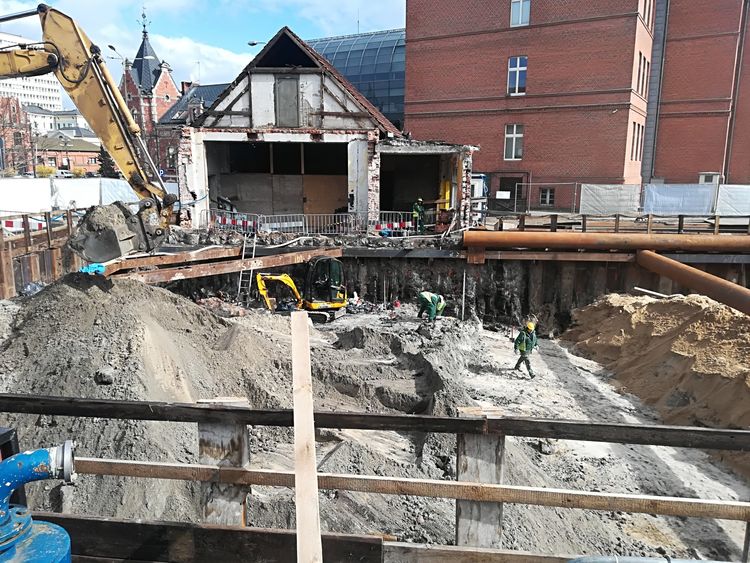 Obecnie wykonywane są prace związane z podbudową pod płytę fundamentową. Postępują one od strony południowej w kierunku Rybiego Rynku. Ich zakres jest ściśle uzależniony od postępu prac archeologicznych, które jeszcze trwają w północnej części działki. Po ich zakończeniu możliwe będzie dokończenie podbudowy oraz wykonie płyty fundamentowej. Na czas tych prac wykop zabezpieczają tymczasowe stalowe rozpory. Wykonawca uzyskał też zgodę konserwatorską na rozbiórkę ściany od strony ul. Podwale do poziomu zerowego i jej rekonstrukcję z użyciem zachowanego materiału.