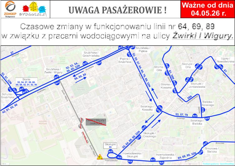 Na Górzyskowie autobusy linii nr 64, 69 i 89 będą kierowane trasą czasowo zmienioną ulicami Szubińską, Piękną, Solskiego, ks. Skorupki.