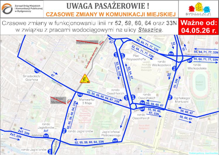 Od dnia 1 maja 2026 r. (piątek) w soboty niedziele i święta międzygminna linia nr 40 będzie kursowała w relacji Przylesie P+R – Ostromecko. Linią nr 52 łatwiej będzie dojechać do Myślęcinka – więcej kursów w weekendy dojeżdzać będzie do pętli na wysokości zoo. Drogowcy udrożnią też przejazd ulicą Rekreacyjną na wysokości rozbudowywanej pętli Las Gdański. Z początkiem maja do 30 września linia nr 73 będzie funkcjonować według tzw. letniego rozkładu jazdy (obsługa Dworca Bielawy we wszystkie dni tygodnia).