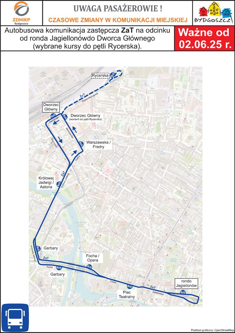 Zostanie uruchomiona także autobusowa komunikacja zastępcza w relacji rondo Jagiellonów - Dworzec Główny (wariantowo do pętli Rycerska). Oznaczona będzie symbolem „ZaT”.