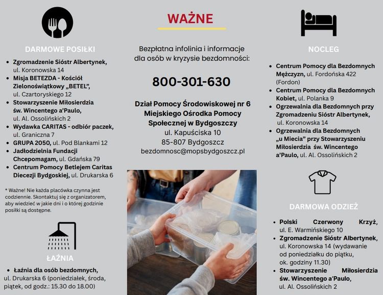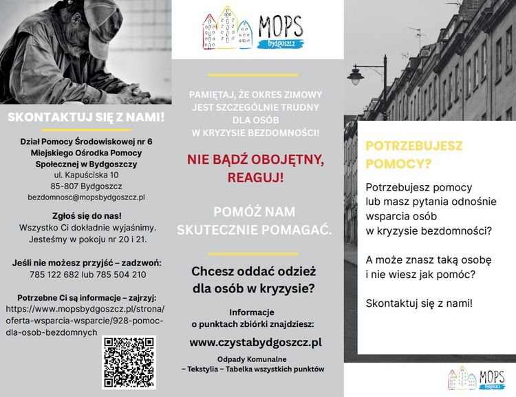Potrzebujesz pomocy lub masz pytania odnośnie wsparcia osób w kryzysie bezdomności? A może znasz taką osobę i nie wiesz jak jej pomóc? Skontaktuj się z Działem Pomocy Środowiskowej nr 6 Miejskiego Ośrodka Pomocy Społecznej w Bydgoszczy (ul. Kapuścińska 10). Jeśli nie możesz przyjść, zadzwoń pod nr tel. 785-122-682 lub 785-504-210. Więcej informacji TUTAJ.