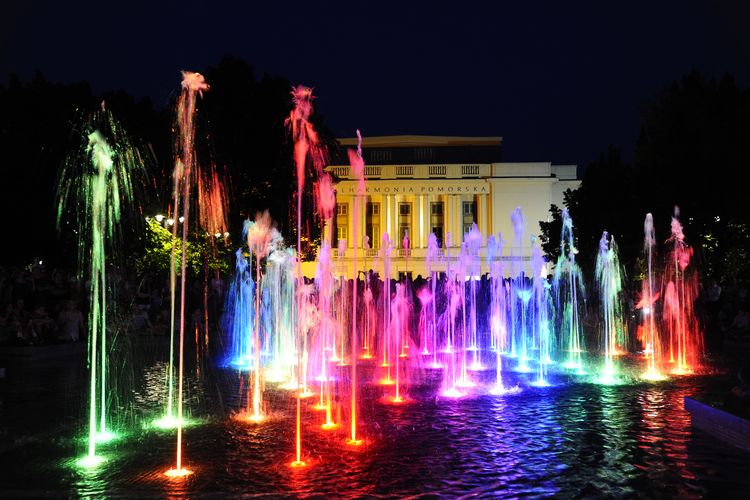 Fontanna multimedialna została uruchomiona w maju 2014 w dzielnicy muzycznej, na skraju parku Jana Kochanowskiego. Otoczona budynkami Filharmonii Pomorskiej, Akademii Muzycznej oraz Państwowego Zespołu Szkół Muzycznych, ale także galerią pomników wybitnych kompozytorów i wirtuozów. Zajęła miejsce wodotrysku w kształcie organów skonstruowanego jeszcze w latach 70-tych XX wieku z inicjatywy budowniczego i długoletniego dyrektora Filharmonii Andrzeja Szwalbego.