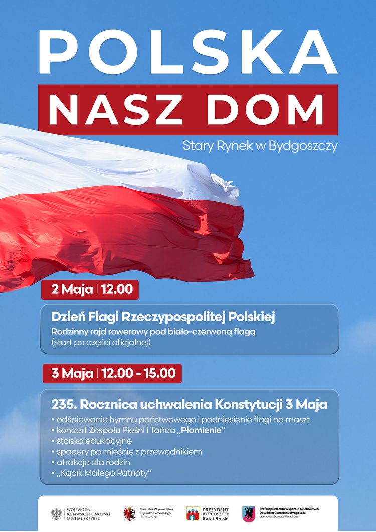 Początek maja to wyjątkowe dni w historii Polski. W sobotę, 2 maja świętować będziemy Dzień Flagi. Z tej okazji zapraszamy bydgoszczanki i bydgoszczan na Stary Rynek. O godz. 12.00 odśpiewany zostanie Hymn Państwowy, a na maszt wciągnięta zostanie biało-czerwona flaga. Po oficjalnej uroczystości nastąpi start do rodzinnego rajdu rowerowego. Jego meta znajdować się będzie na nabrzeżach w Starym Fordonie. Zapisy - TUTAJ.