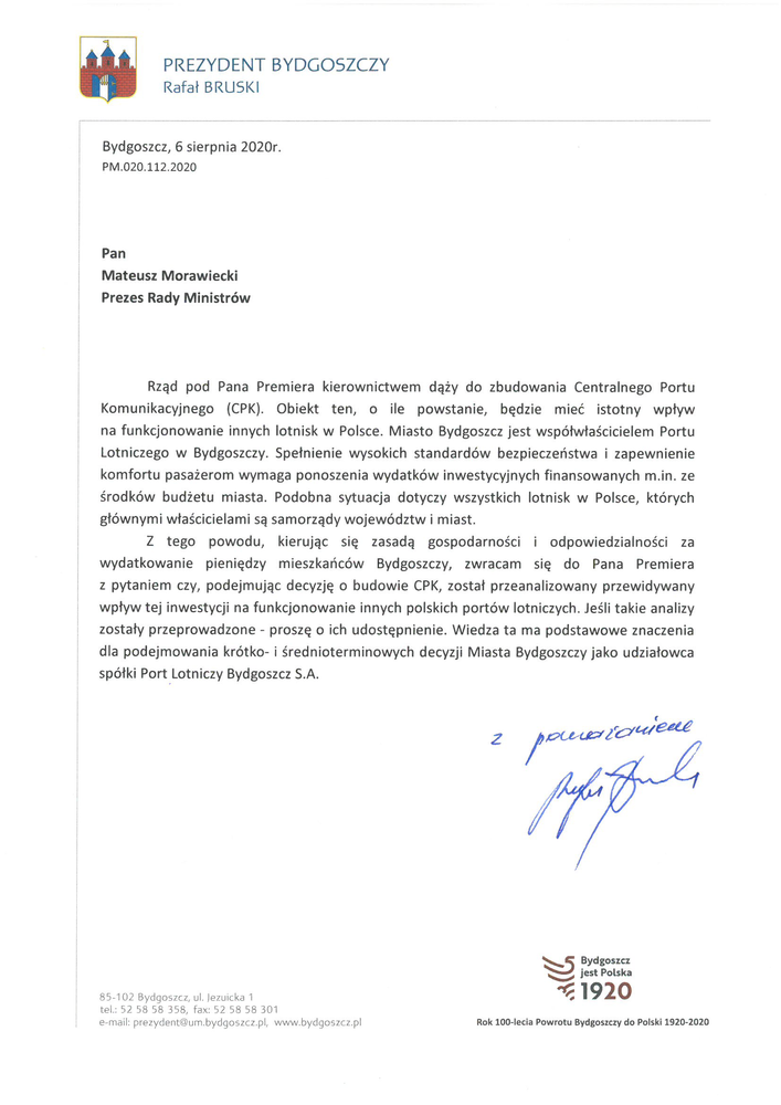 Plany rządu dotyczące zbudowania Centralnego Portu Komunikacyjnego mogą mieć istotny wpływ na funkcjonowanie innych lotnisk w Polsce. W związku z tym, prezydent Rafał Bruski zwrócił się do premiera Mateusza Morawieckiego z pytaniem o ewentualne skutki takiego przedsięwzięcia w odniesieniu do innych polskich lotnisk, w tym bydgoskiego Portu Lotniczego. Poniżej treść pisma: