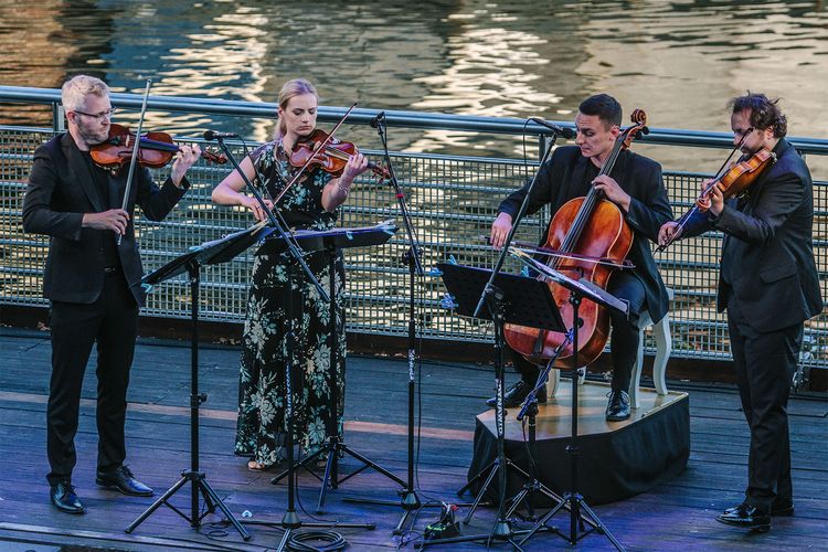 Jeden z najlepszych polskich kwartetów smyczkowych, który od lat podbija serca melomanów w najbardziej prestiżowych salach koncertowych Europy i świata, zagrał dla bydgoskiej publiczności podczas kolejnego koncertu tegorocznej edycji Rzeki Muzyki. Meccore String Quartet, trzykrotnie nominowany do nagrody Fryderyków, zwycięzca najbardziej renomowanych konkursów i festiwali muzycznych, poprowadził słuchaczy w świat kwartetu smyczkowego. Widzowie zgromadzeni w amfiteatrze Opery Nova usłyszeli dzieło Józefa Haydna - Kwartet smyczkowy D-dur op. 20 nr 4, a także Kwartet smyczkowy nr 1 g - moll op. 27 Edwarda Griega. Niezwykłe umiejętności artystów z Meccore String Quartet sprawiły, że bydgoska scena na wodzie zamieniła się w niedzielny wieczór w najwspanialszą salę koncertową pod gołym niebem.