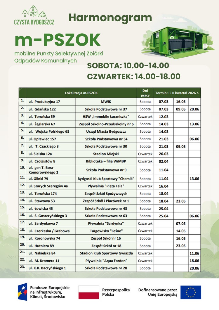 „Miasto Bydgoszcz realizuje projekt „Rozbudowa sieci miejskich PSZOK na terenie Bydgoszczy” dzięki dofinansowaniu z Funduszu Spójności w ramach programu Fundusze Europejskie na Infrastrukturę, Klimat, Środowisko 2021–2027, Działanie 01.04 Gospodarka odpadami oraz gospodarka o obiegu zamkniętym.”