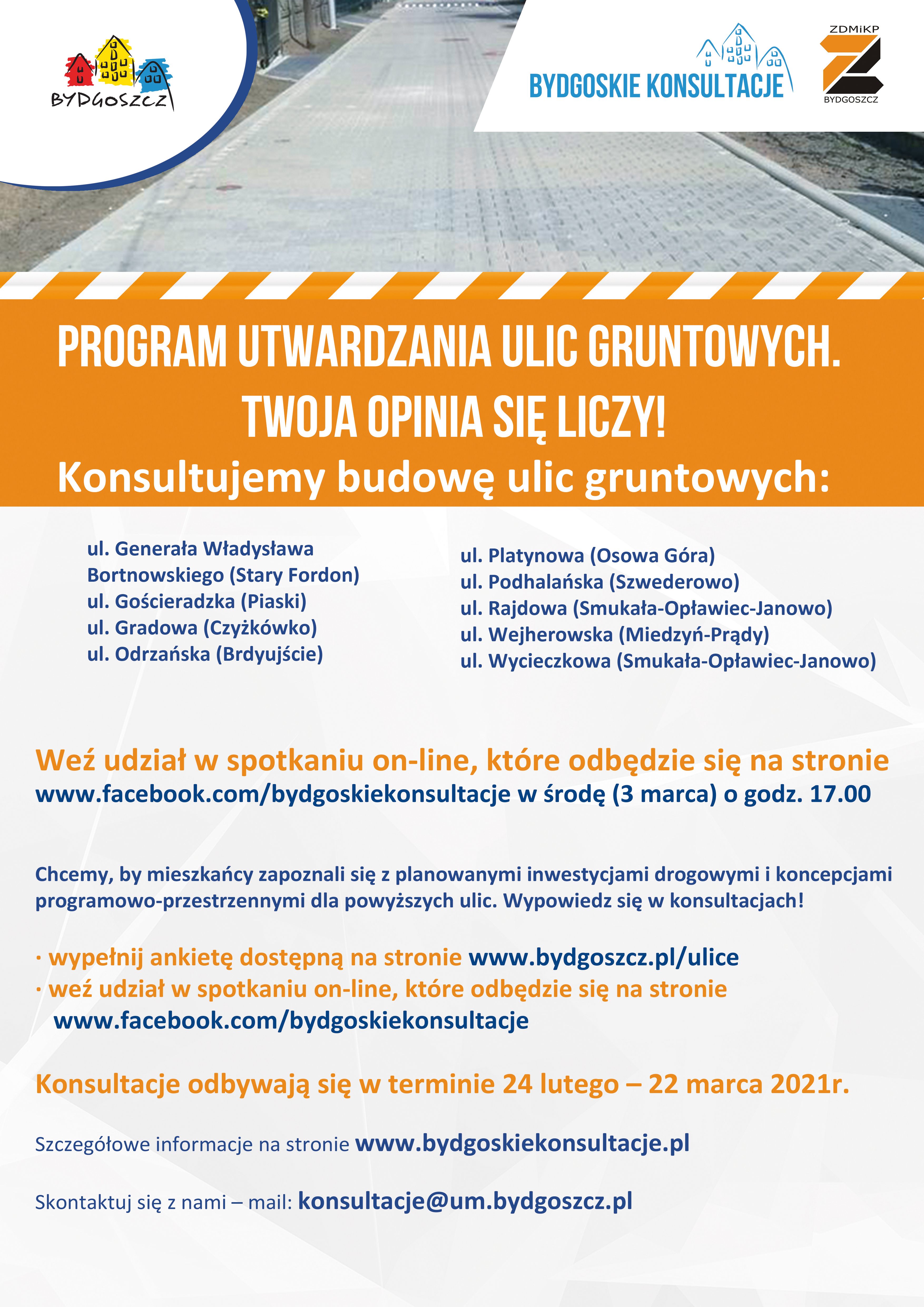 Dodatkowo w dniu 3 marca o godz. 17.00 odbędzie się spotkanie on-line dla mieszkańców na profilu Bydgoskie Konsultacje na facebooku: www.facebook.com/bydgoskiekonsultacje.