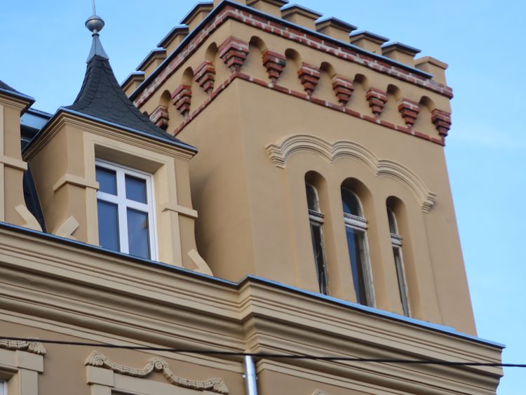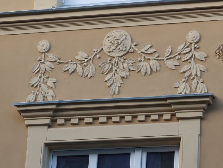 W środkową część fasady wkomponowane zostało wejście flankowane pilastrami. Parterowa część budynku zdobiona jest boniowaniem. Znajdujące się w niej lokale mają charakter suteren. Wyższe partie elewacji zdobione naczółkami, płaskorzeźbami z motywami roślinnymi i gzymsami. Warte uwagi są również lukarny przykryte daszkami w kształcie ostrosłupów z wklęsłymi ścianami i zwieńczone iglicami. Całość, mimo zróżnicowania stylów, bardzo dobrze się komponuje i przywołuje skojarzenia z architekturę pałacową.