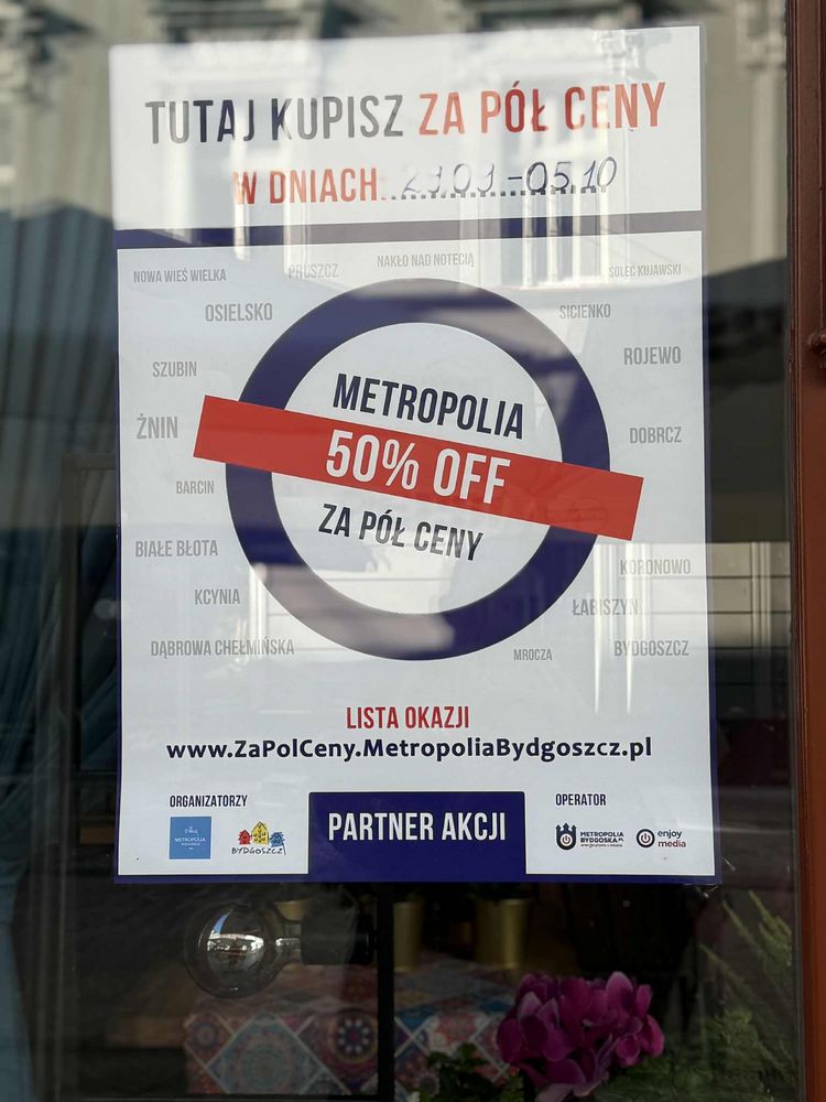 Metropolia za pół ceny tradycyjnie odbywa się na przełomie września i października. Wydarzenie jest kontynuacją akcji Bydgoszcz za pół ceny, która zasięgiem obejmuje także gminy wchodzące w skład Stowarzyszenia Metropolia Bydgoszcz: Białe Błota, Barcin, Bydgoszcz, Dąbrowę Chełmińską, Dobrcz, Kcynię, Koronowo, Łabiszyn, Mroczę, Nakło, Nową Wieś Wielką, Osielsko, Pruszcz, Rojewo, Sicienko, Solec Kujawski, Szubin oraz Żnin.
