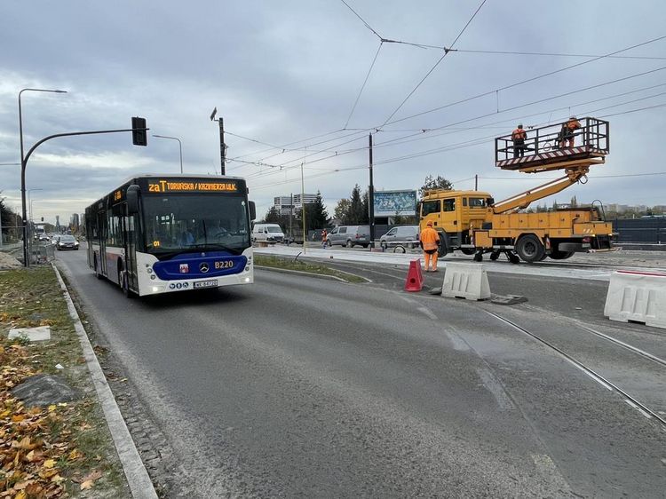 W ubiegłym tygodniu zamknięte zostało torowisko od ronda Toruńskiego w kierunku mostu. Pozwoliło to prowadzić prace przy rozwieszaniu sieci trakcyjnej na ul. Toruńskiej w kierunku ul. Perłowej. W tym tygodniu wykonawca planuje (przy sprzyjających warunkach pogodowych) ułożyć ostatnią warstwę nawierzchni na północnej jezdni ul. Toruńskiej (od strony ogródków działkowych). Po zakończeniu powyższych robót (przełom listopad/grudzień) wykonawca ubiegać będzie się o wymagane pozwolenia a po ich uzyskaniu, uruchomiony zostanie już docelowy układ linii z wykorzystaniem mostu tramwajowego i torowiska wzdłuż ul. Perłowej.