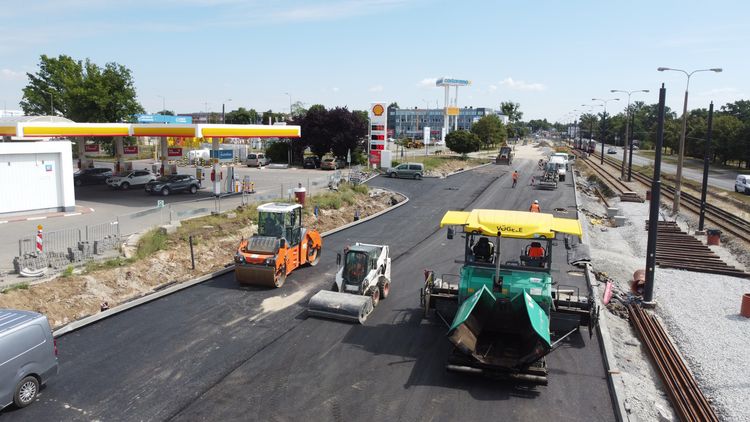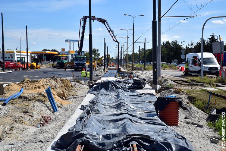 Ustawione zostały słupy trakcyjne i krawężniki. Rozpoczęto układanie podkładów oraz warstw bitumicznych przy jezdniach.