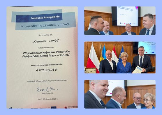 W dniu 28.08.2025 r. Łukasz Jaworski, Dyrektor Wojewódzkiego Urzędu Pracy w Toruniu wraz z Iwoną Michałek, Kierownikiem Projektu, odebrali z rąk Piotra Całbeckiego, Marszałka Województwa Kujawsko-Pomorskiego, potwierdzenie zawarcia umowy o dofinansowanie projektu „Kierunek - Zawód”.