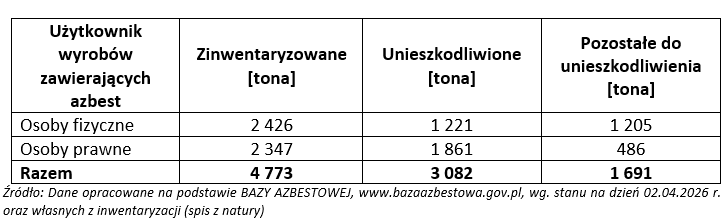 Na terenie miasta Bydgoszczy w 2025 r. zinwentaryzowano 4 773 tony wyrobów zawierających azbest, z czego szacuje się, że dotychczas usuniętych zostało 3 082 ton (64,57%).